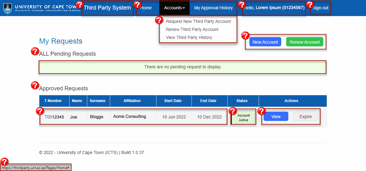 The home page of a UCT Third Party System consists of the following areas: